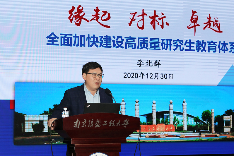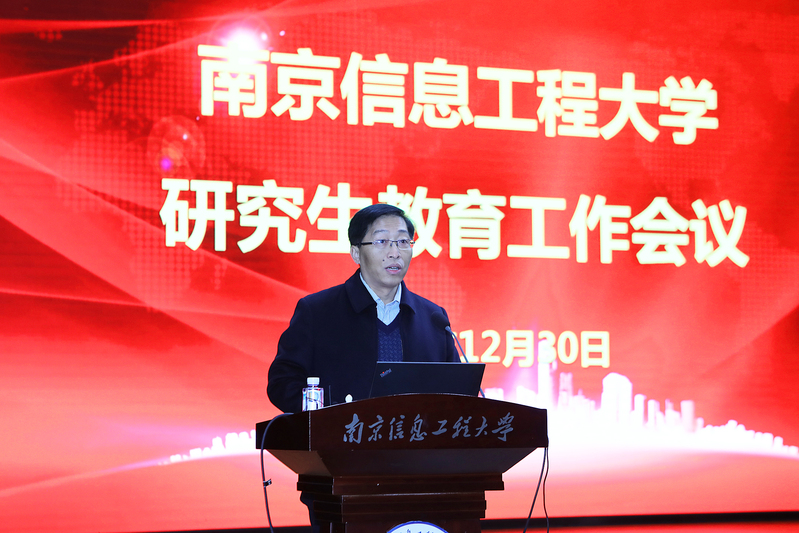 12月30日,我校召开研究生教育工作会议,深入贯彻落实习近平总书记对研究生教育的重要指示、全国研究生教育会议和江苏省研究生教育会议精神,系统总结我校研究生教育历程与经验,围绕“立德树人、服务需求、提高质量、追求卓越”主题,全面把握国家“十四五”规划和江苏教育现代化2035远景目标要求,全力谋划学校研究生教育发展目标蓝图。江苏省教育厅一级巡视员洪流应邀出席会议。校党委书记管兆勇、校长李北群等全体在校校领导,全体中层干部、研究生辅导员、研究生教学秘书,导师代表及研究生代表等参加会议。本次会议设有南京信息工程大学无锡研究生院视频分会场。